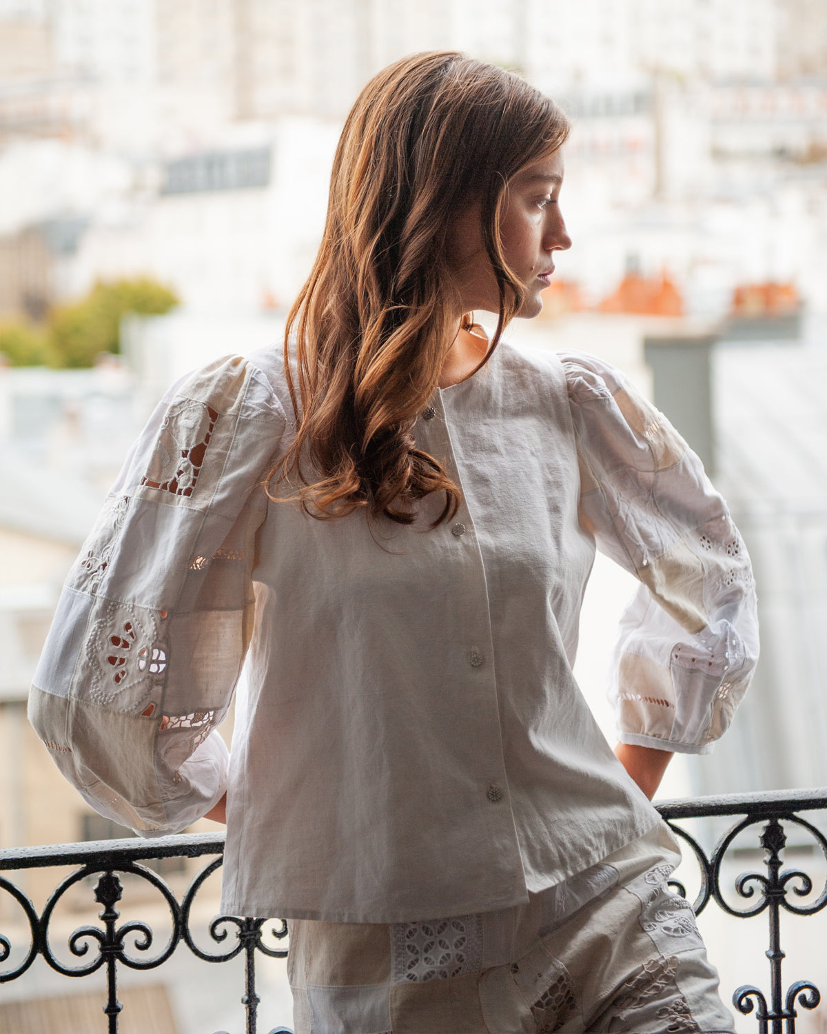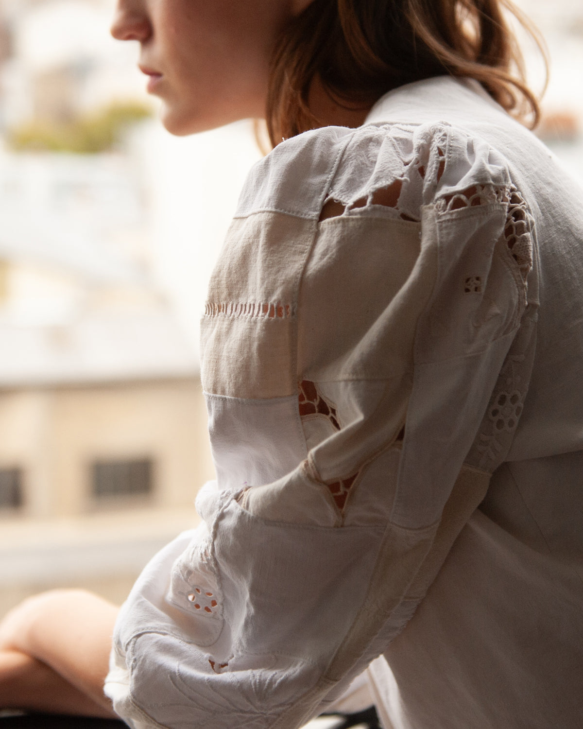 Un chemisier en patchwork de lins anciens brodés main avec un supplément d'âme : Un héritage à porter, célébrer et transmettre."