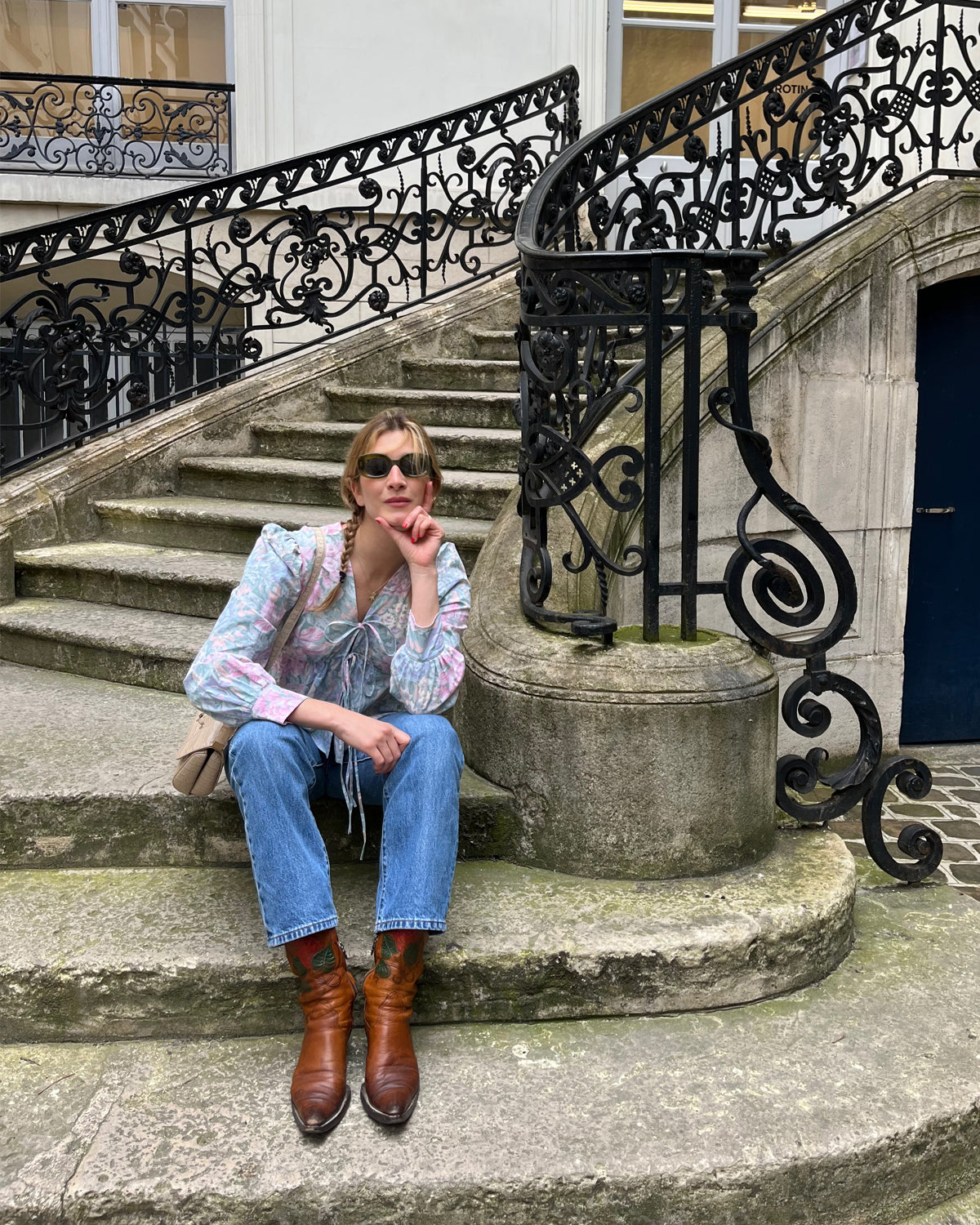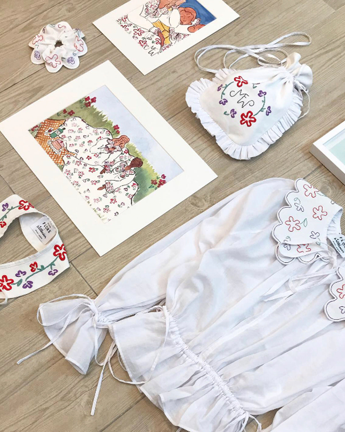 An artistic conversation between fashion and drawing, where the English illustrator’s floral motifs meet the poetry of our hand-embroidered linen blouses and accessories.