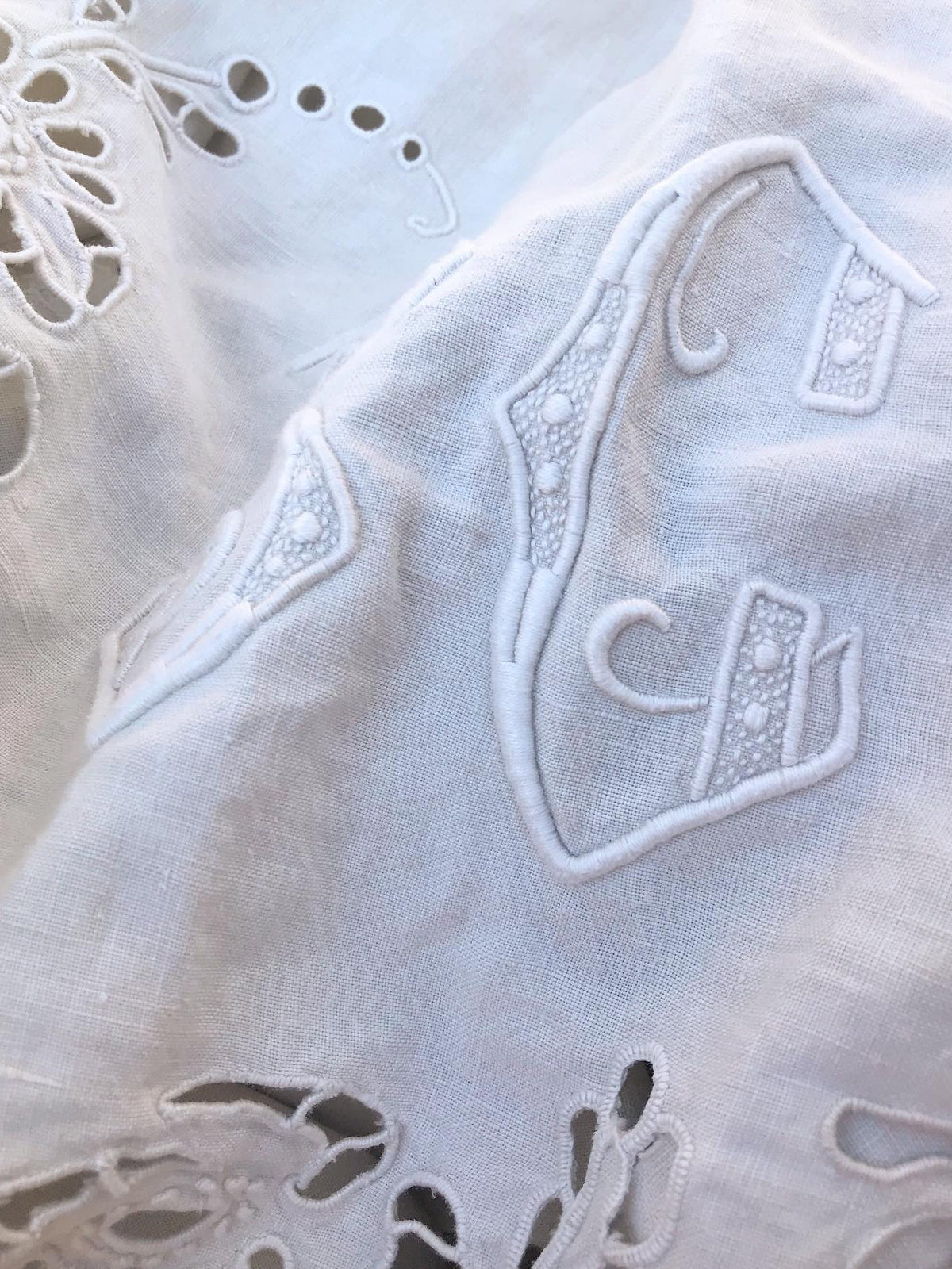 Crafted in Paris by our artisans from antique Trousseau heirlooms, this piece elevates the precious heritage of the French tradition of hand embroidery, while perpetuating both ancestral and contemporary savoir-faire. A living heirloom to be worn, celebrated, and passed on as heritage.