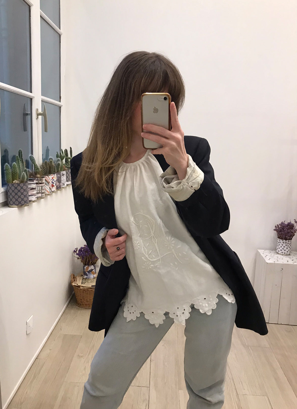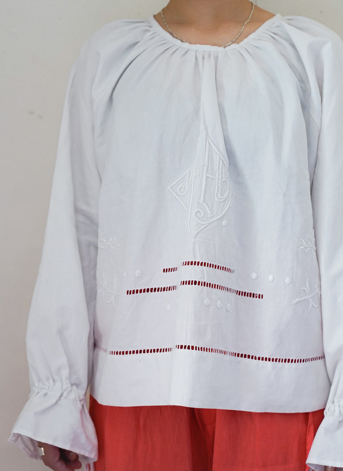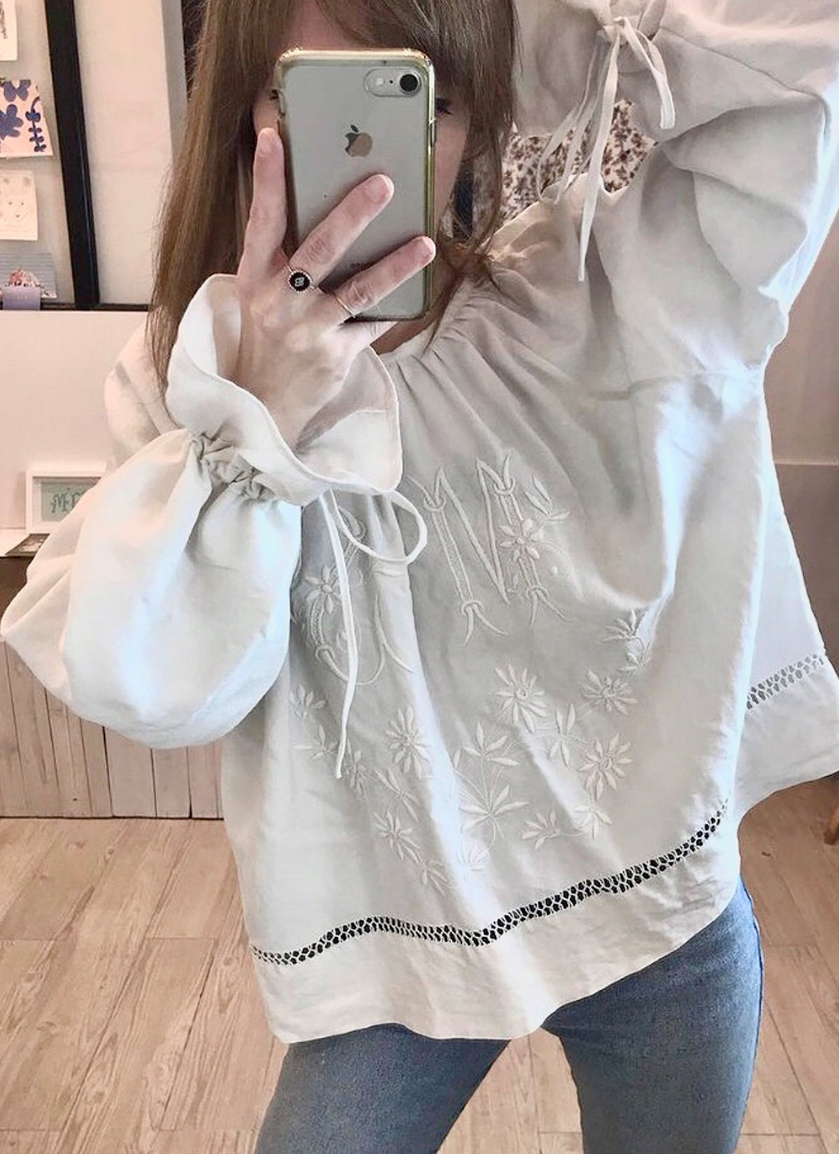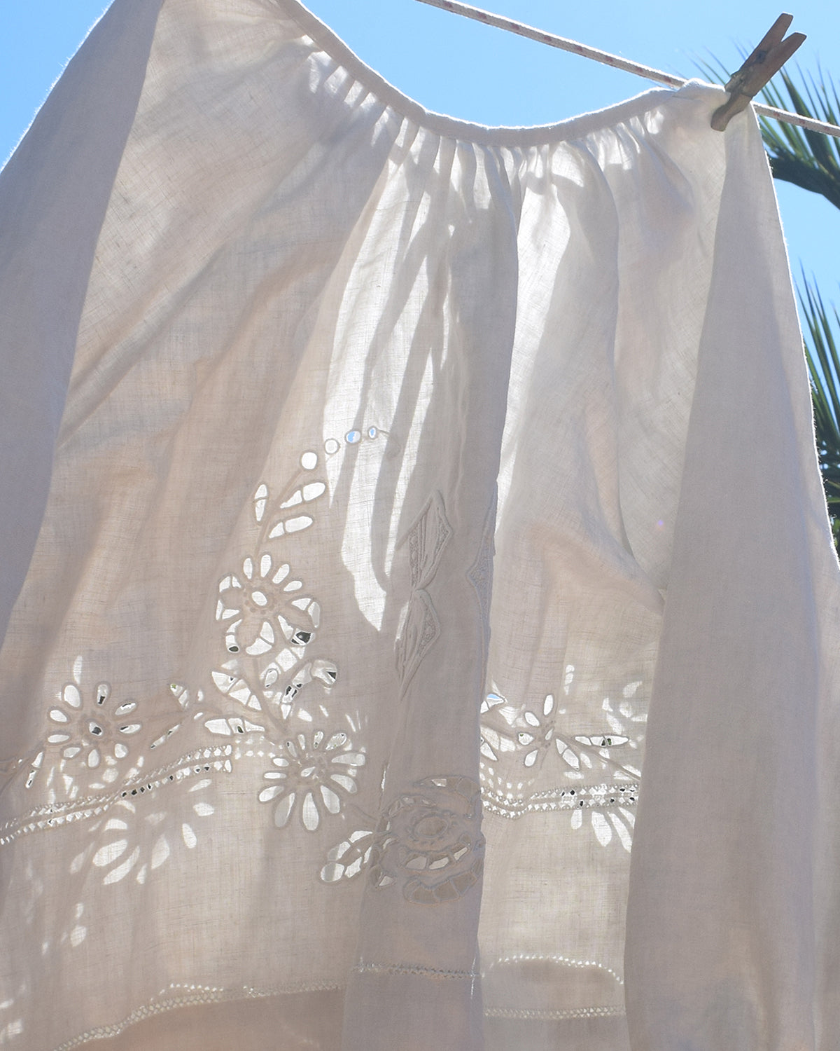Blouse made of antique hand-embroidered linen, carrying a piece of french embroidery history : A living heirloom to be worn, celebrated, and passed on as heritage."
