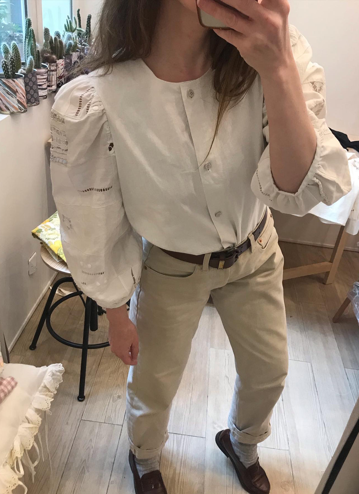 Shirt made of antique linen patchwork, carrying a piece of French embroidery history : A living heirloom to be worn, celebrated, and passed on as heritage."