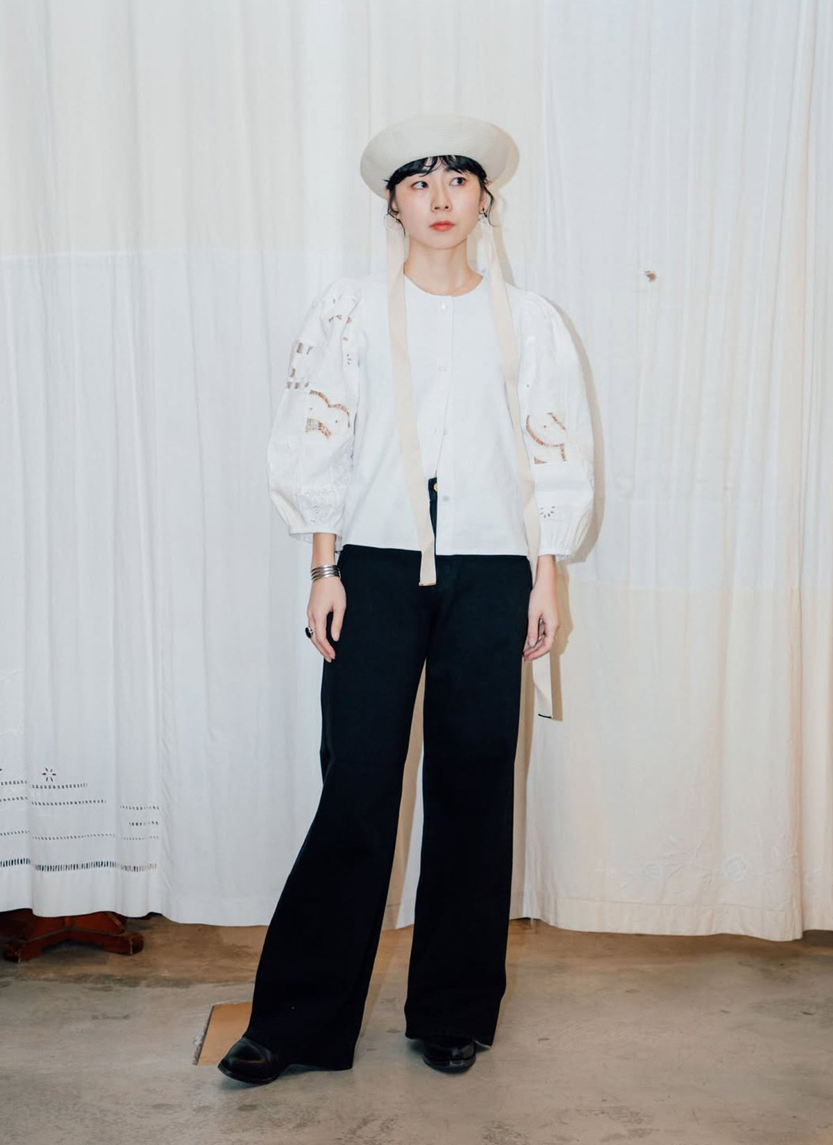 A piece with a clean, slightly structured cut that balances the volume of its spectacular sleeves, perfect for an elegant and confident silhouette. It can be worn tucked into a high-waisted skirt for a poetic and truly distinctive look, or more casually over denim, layered with a sleeveless vest that reveals its unique artisanal embroideries. It’s the effortless Maison Flore piece that will quickly become our new everyday essential.