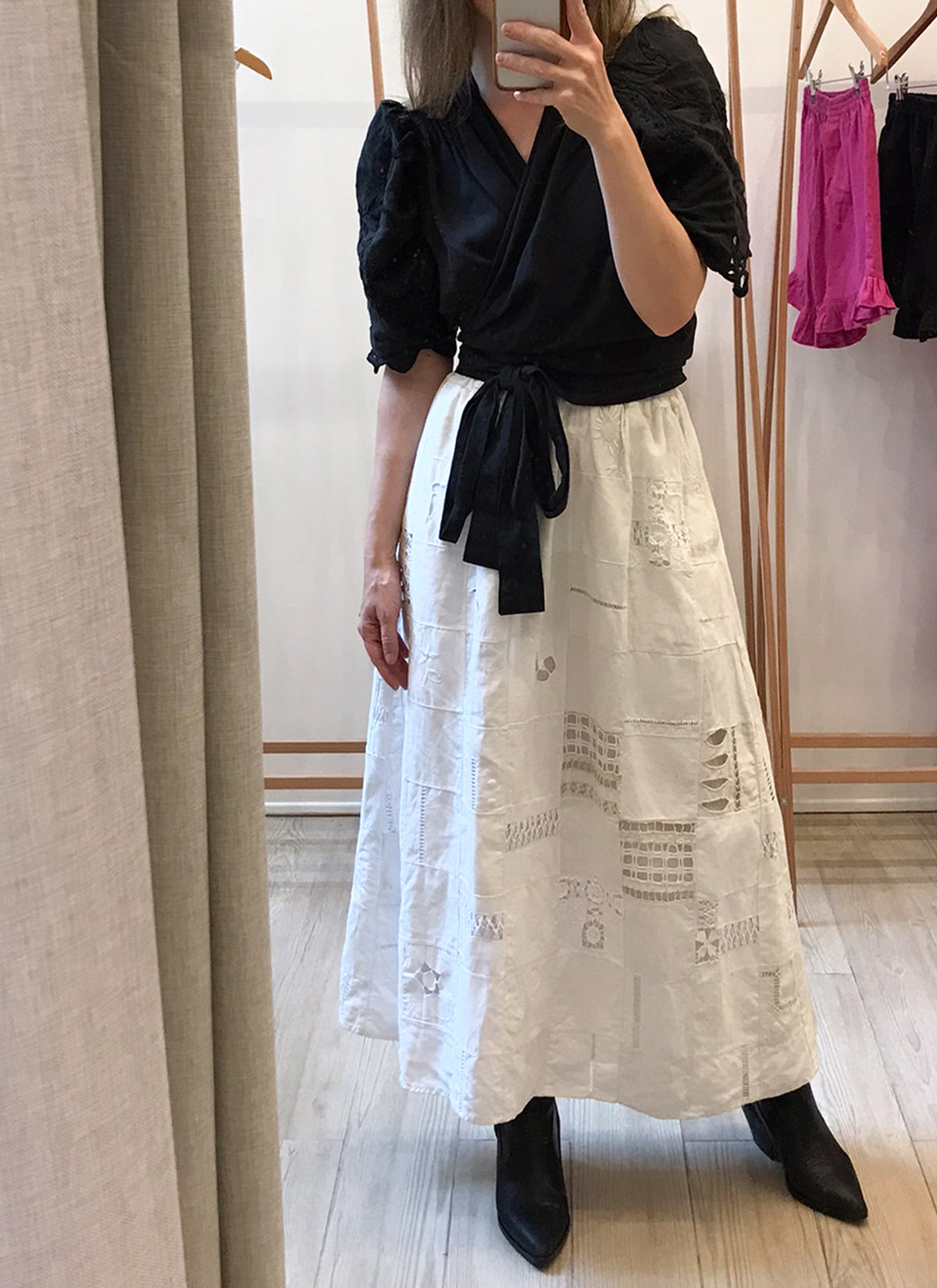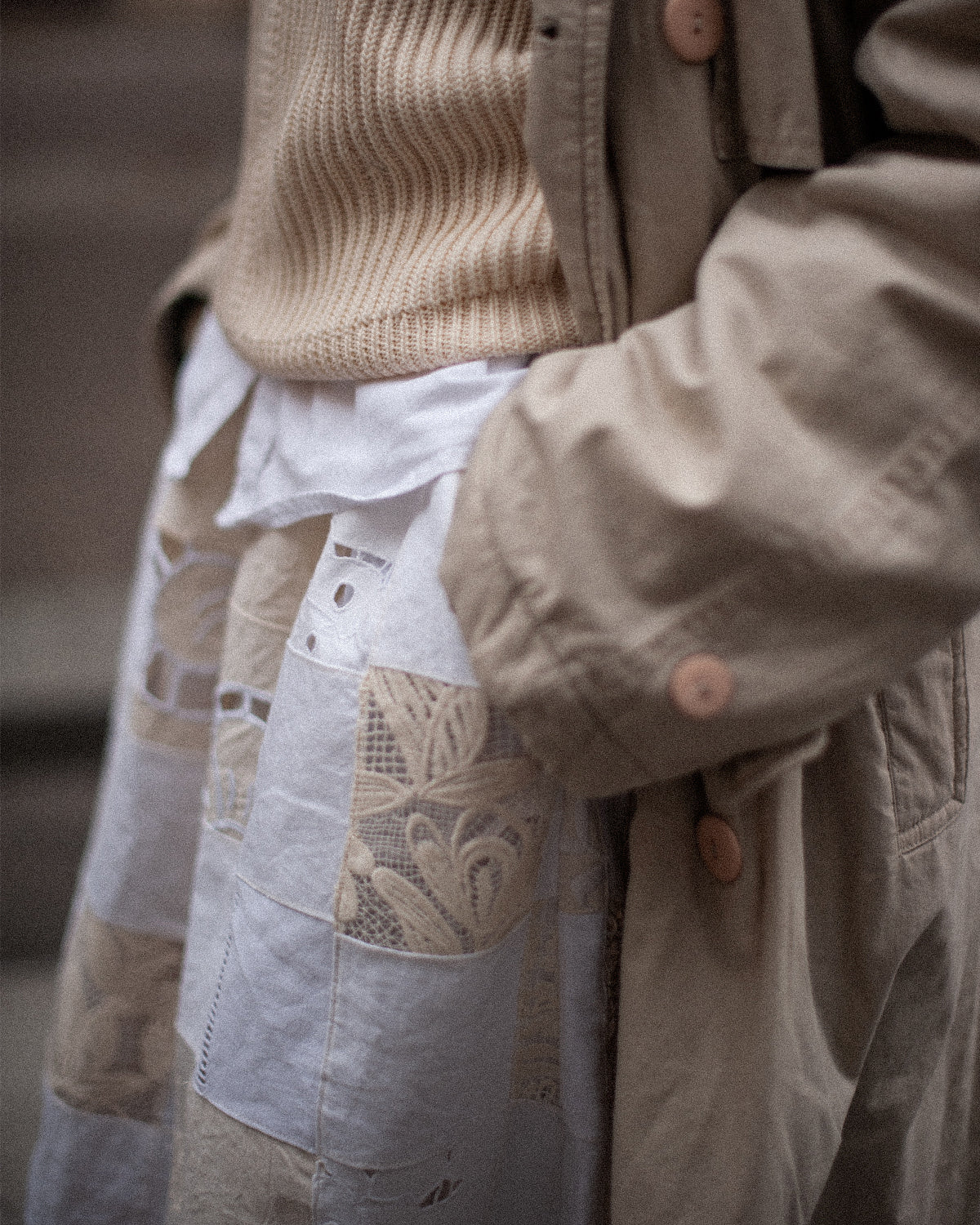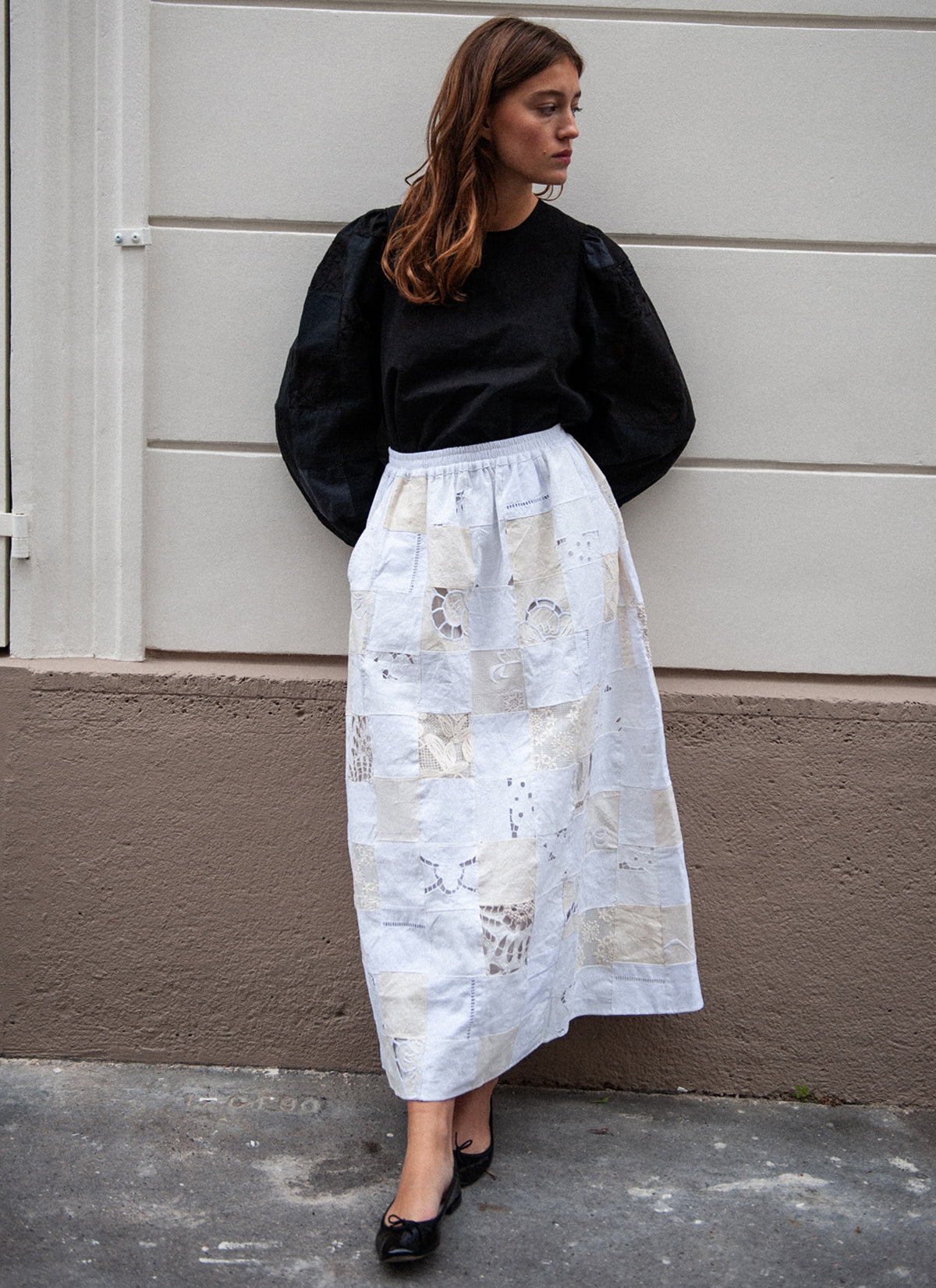 Midi skirt made of antique linen patchwork, carrying a piece of French embroidery history : A living heirloom to be worn, celebrated, and passed on as heritage."