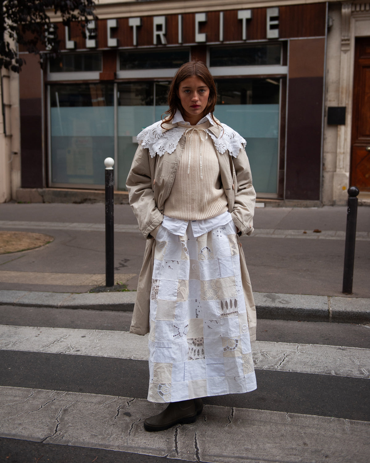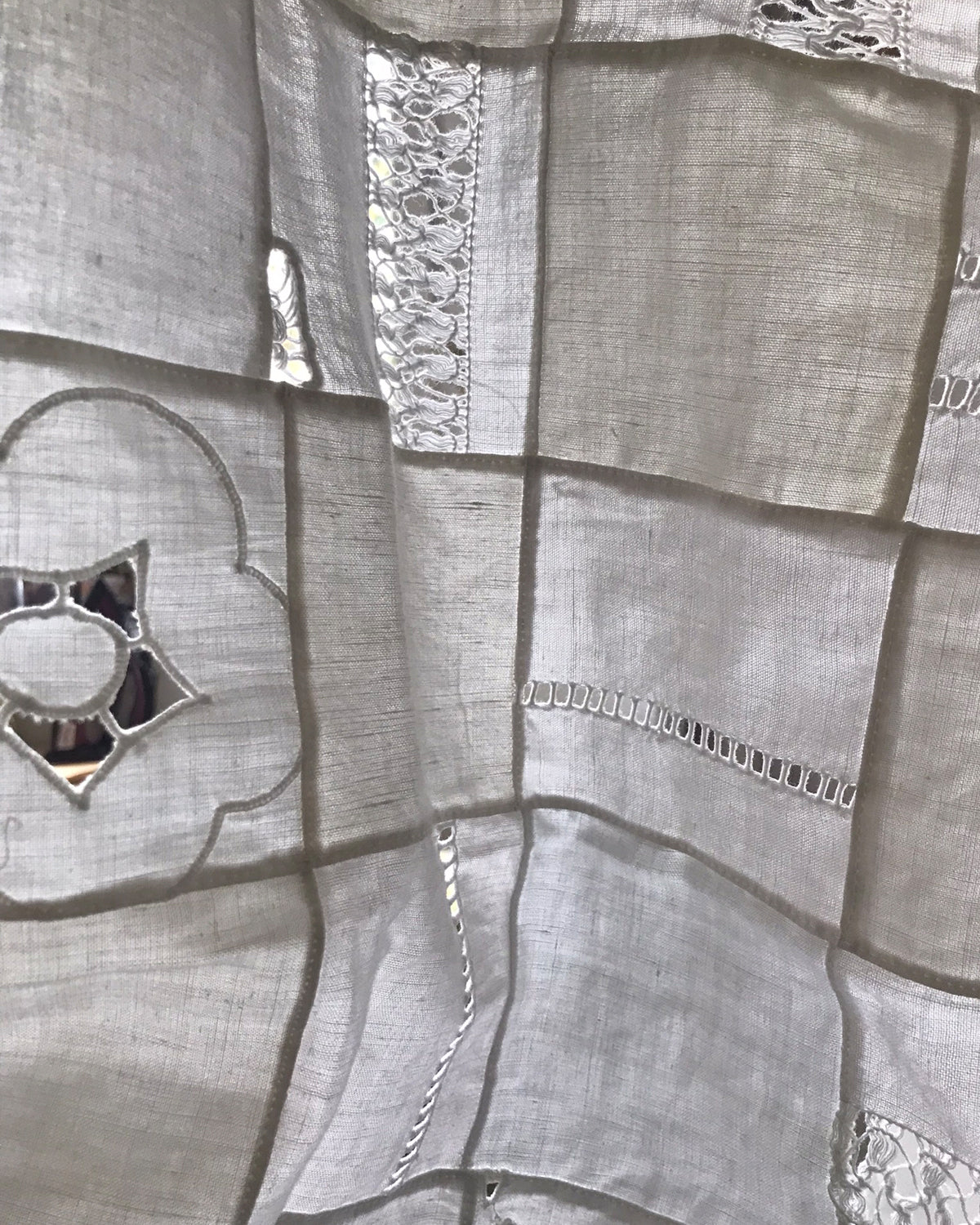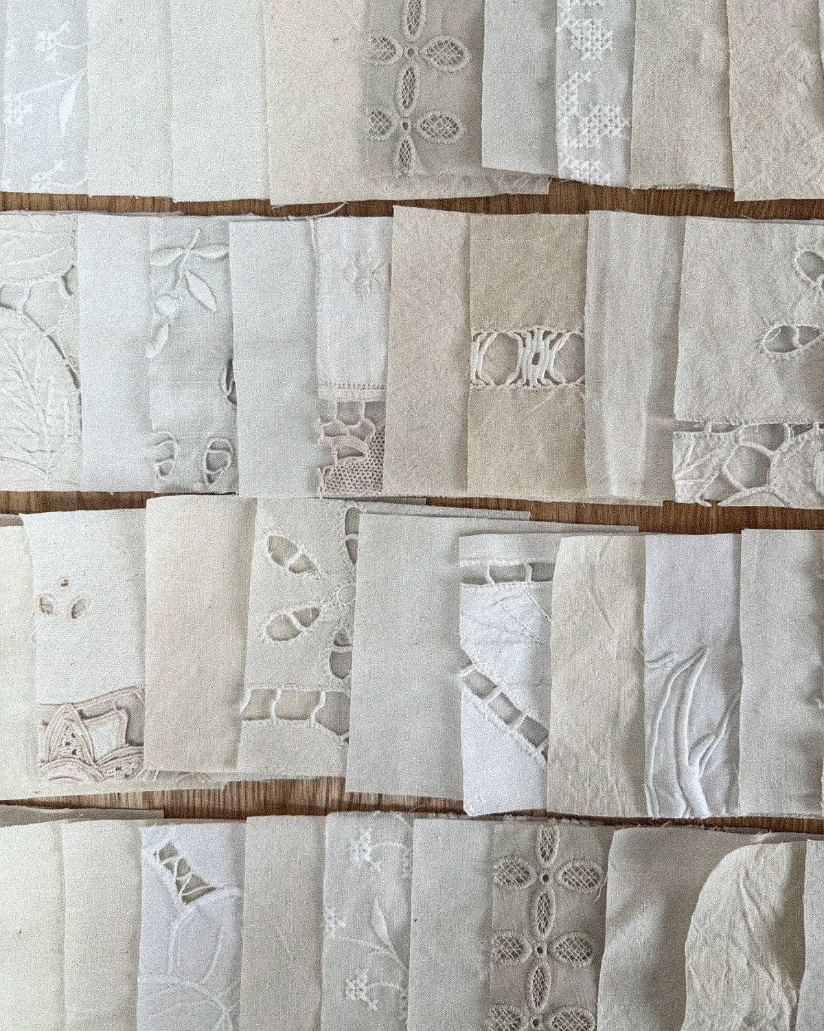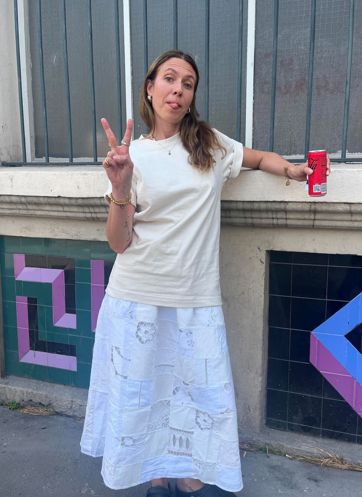 Midi skirt made of antique linen patchwork, carrying a piece of French embroidery history : A living heirloom to be worn, celebrated, and passed on as heritage."