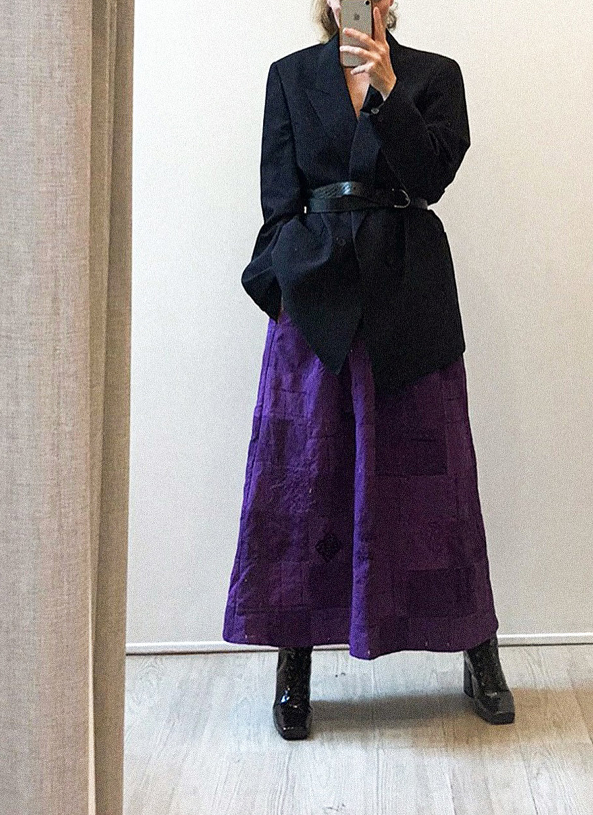 This piece combines natural beauty and durability from the exceptional upcycled linen it is made of, sourced from French recycling centers and private collections. Naturally thermoregulating, it is cool and refreshing in summer, protective in winter ; as delightful to wear with summer sandals as with boots for a rock-inspired edge.